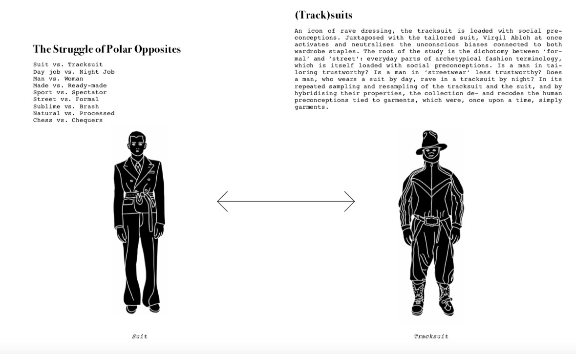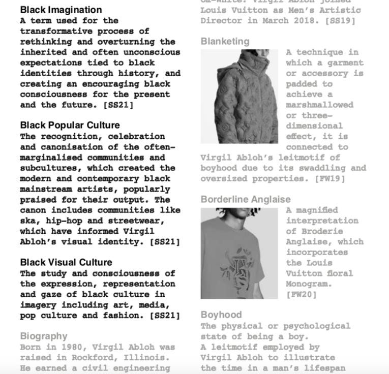 Abloh exercises his position from both prisms: the outsider turned insider; the man with the power to bring young people with him into the former exclusion zone of Haute Couture. This ambition to educate is reflected in the notes he writes after his Louis Vuitton shows. Dozens of pages, in the form of a guide, dictionary or manifesto, serve as quasi-academic supports for the reader. Over and above the inspirations, these explanatory notes40 decipher the sets, soundtracks, motifs and materials used, accompanied by sketches, 3D models and drawings that enable the reader to follow the thread of his creation.